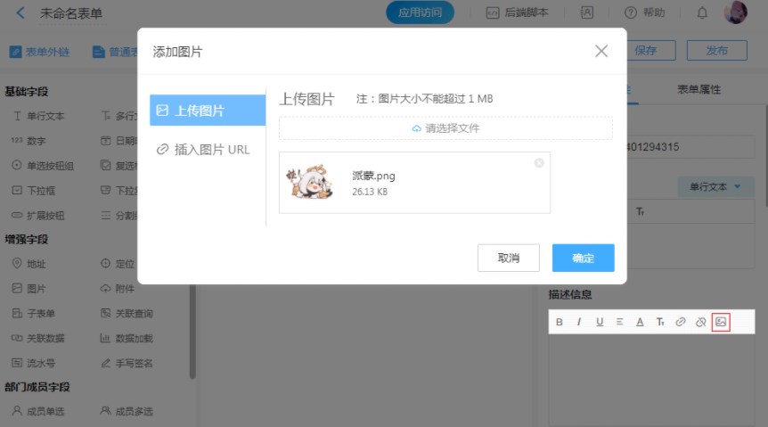 上传图片图片大小不能超过 1 MB。