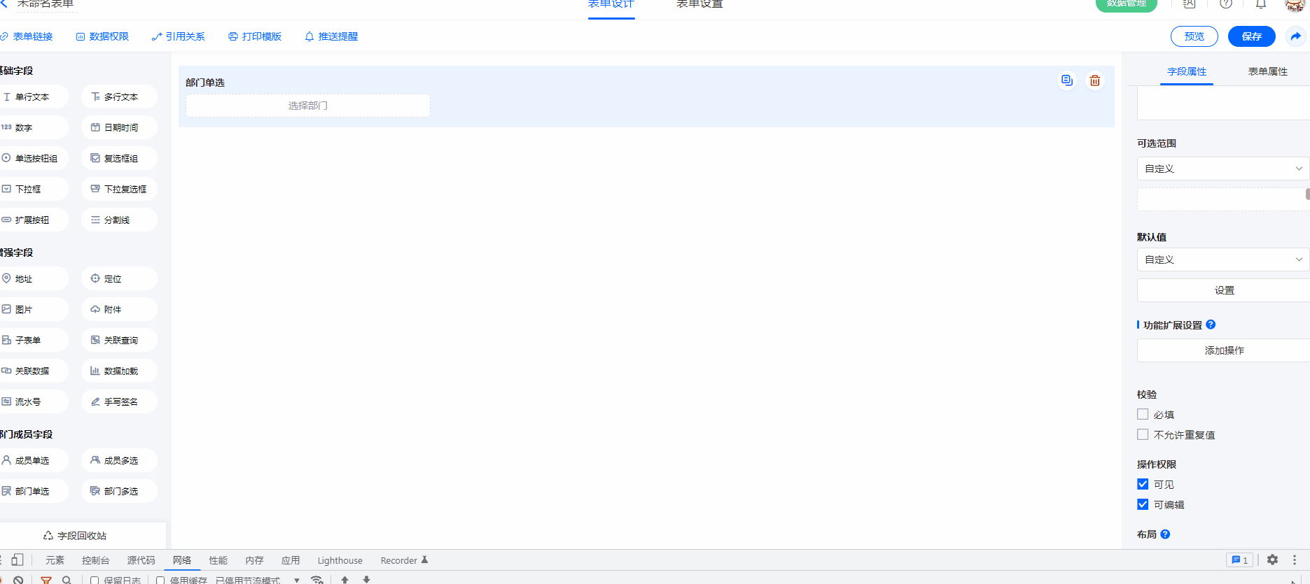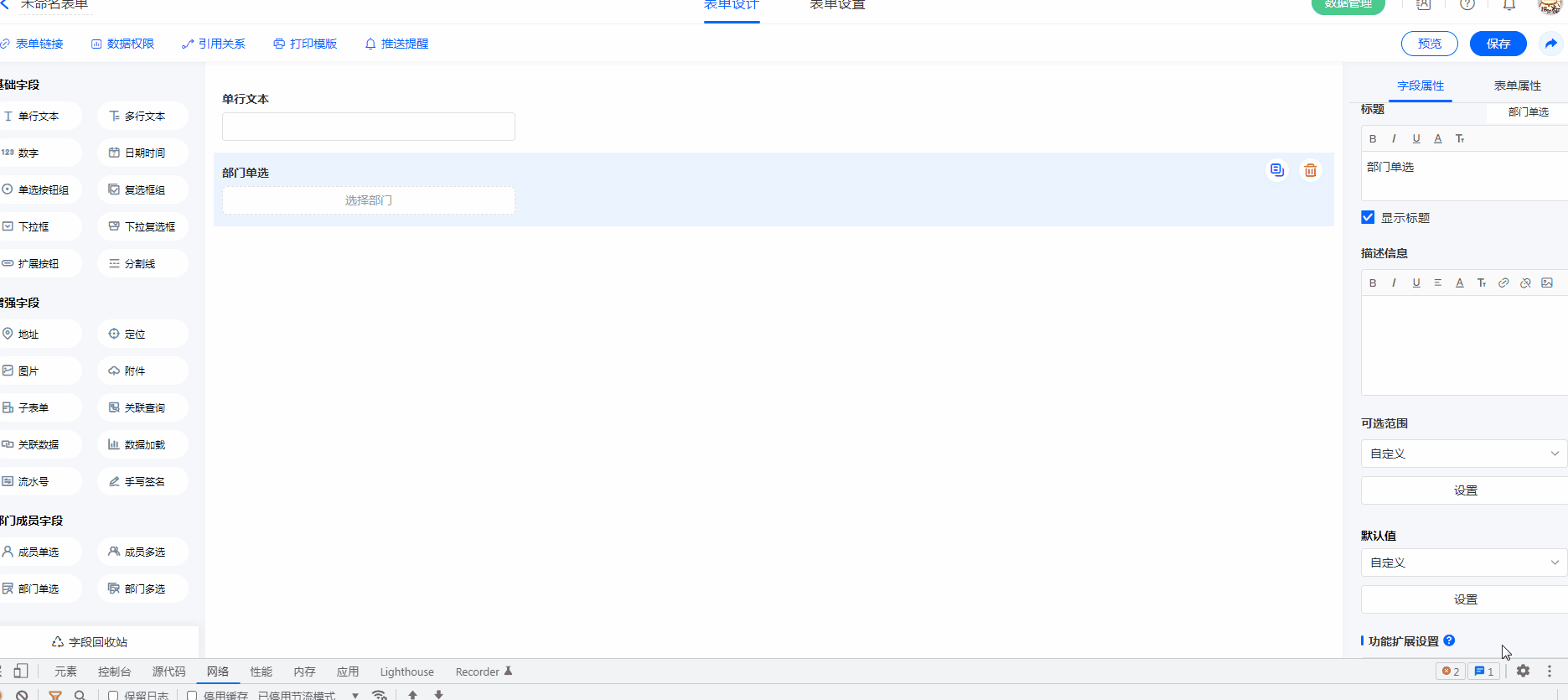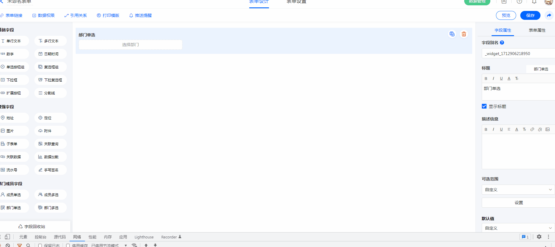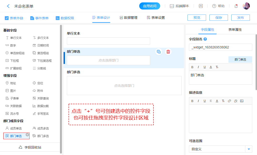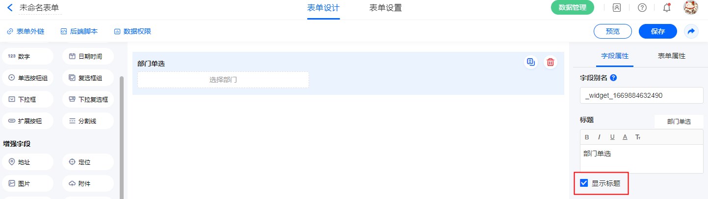 注意:表单外链不支持成员字段/部门字段,只有在系统数账号内访问表单,才可使用成员字段/部门字段。
