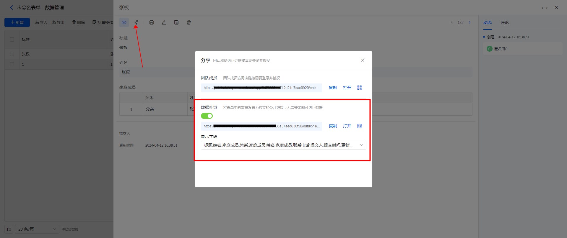 操作步骤:进入“数据管理”页面 > 点开“单条数据” > 点击“分享” > 开启“数据外链”开关。