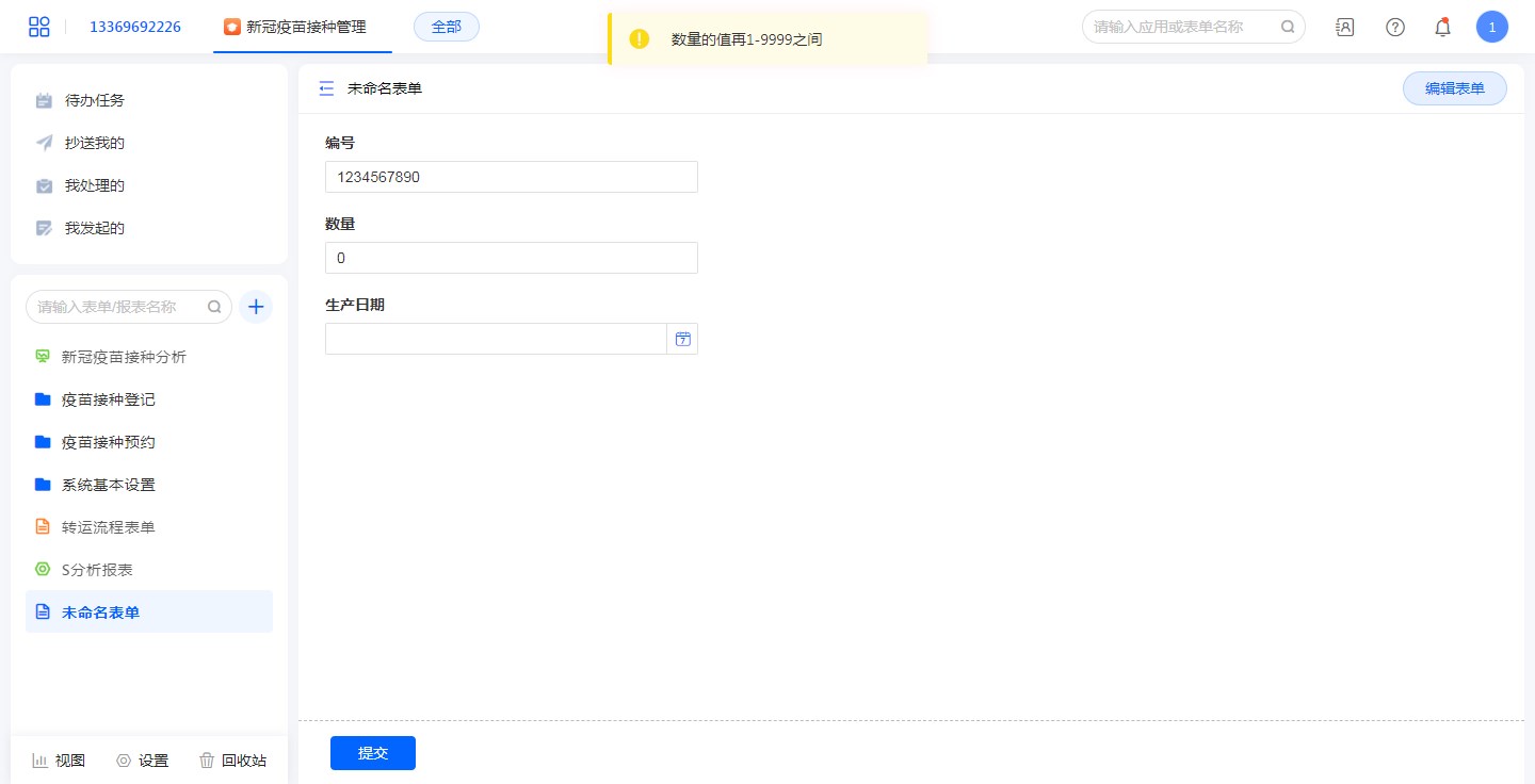 • 公式为:AND(数量>=1,数量<=9999)。表示当数量>=1和数量<=9999同时满足时,才可以提交数据。