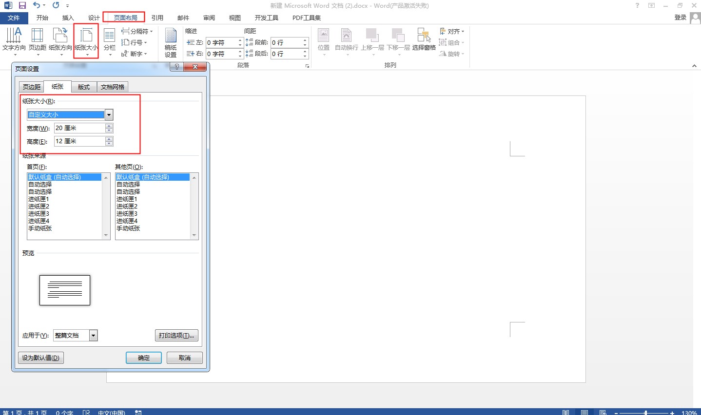 操作方法:【页面布局】-【纸张大小】-【其他页面大小】-【纸张】-【纸张大小:设置为实际纸张大小】-【确定】。