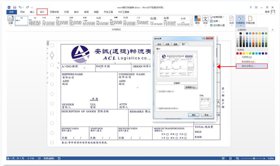 步骤:【设计】-【页面颜色】-【填充效果】-【图片】,插入图片。缩放word面板的大小,使得背景图和面板重合。