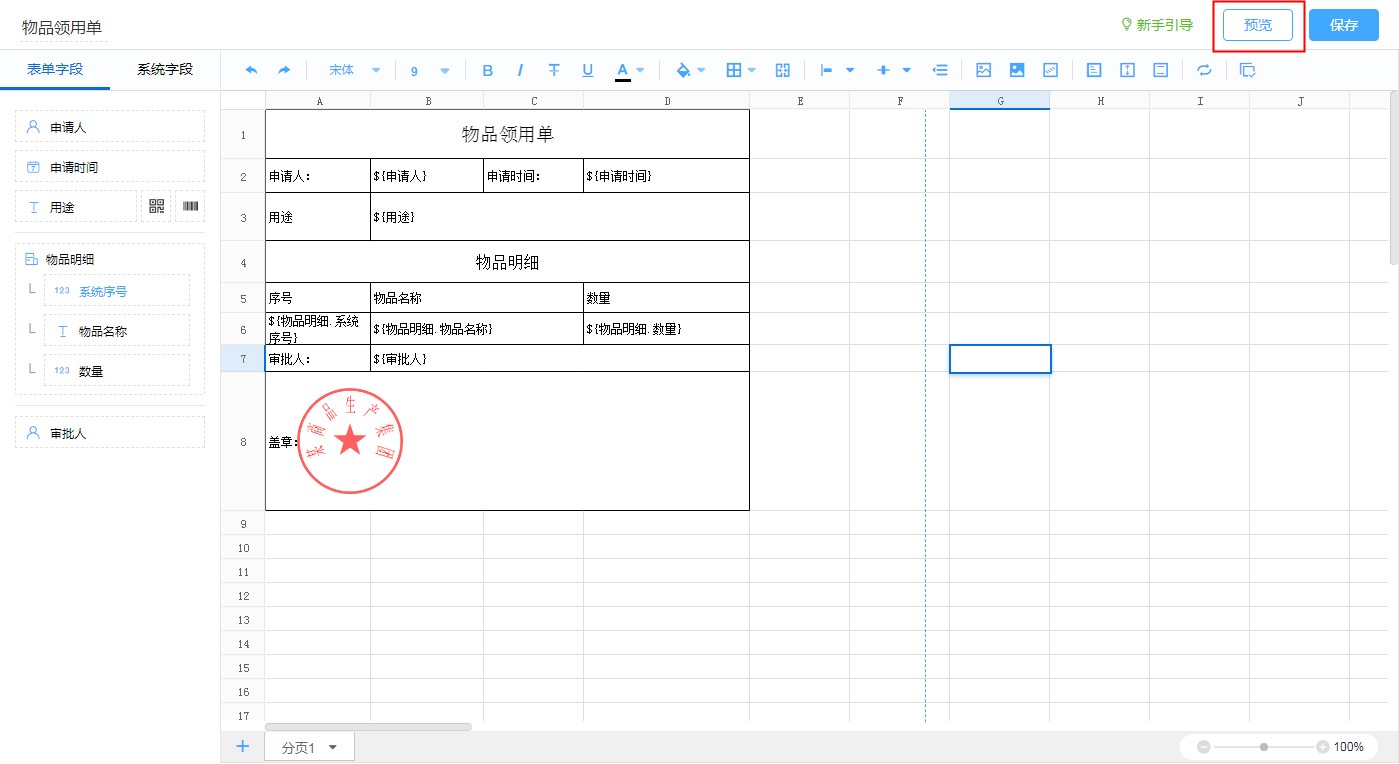 - 设计完成后,点击【预览】按钮,预览打印效果。