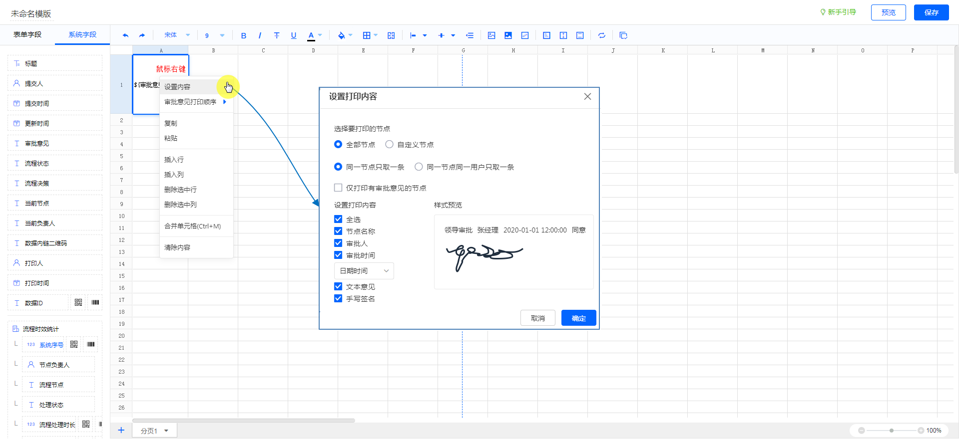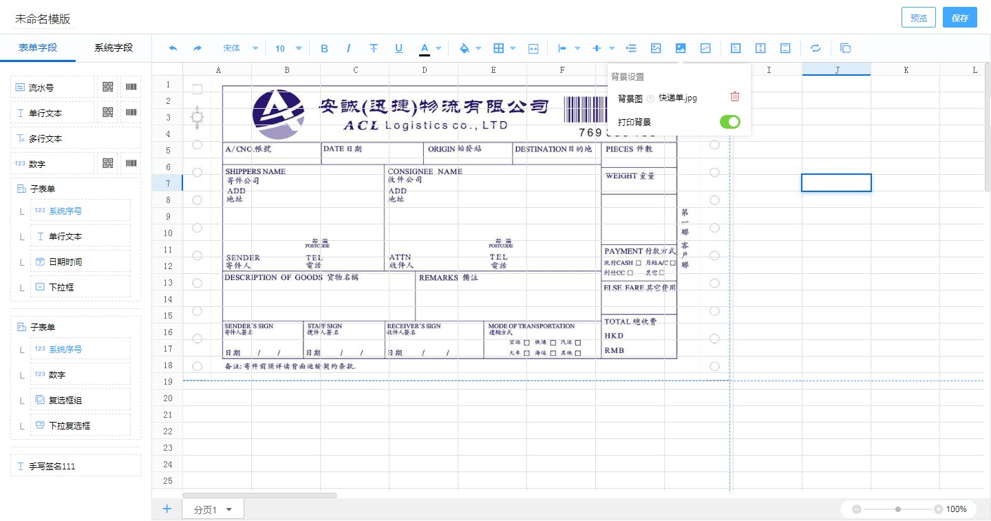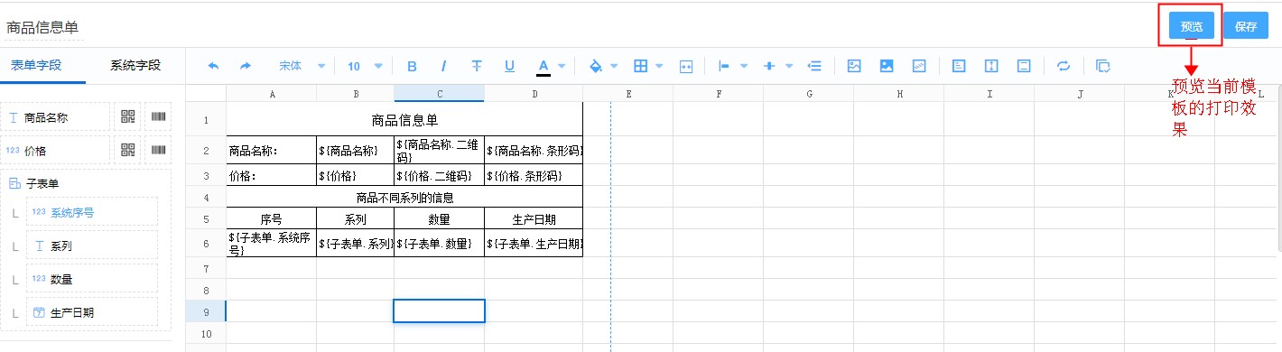 • 在设计模板的时候,当模板做了任何改动,点击预览可以预览打印效果。