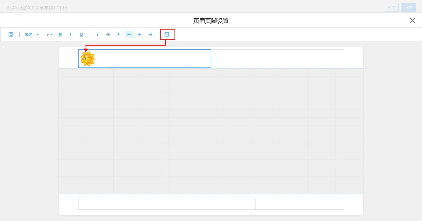 • 插入图片:选中页眉页脚单元格,点击插入图片,可以插入图片到对应的单元格内;图片支持放大缩小。