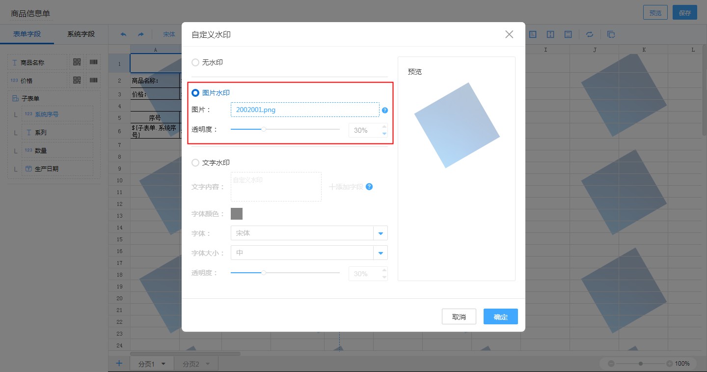 图片水印:图片最大100k,水印图片最大显示为128px*128px。