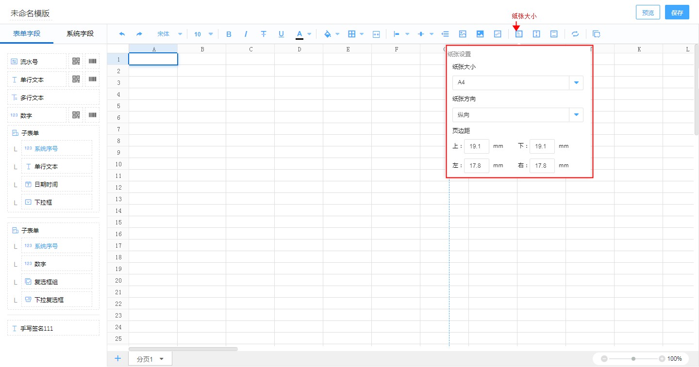 • 系统预设常见的纸张大小,也可自定义纸张大小。