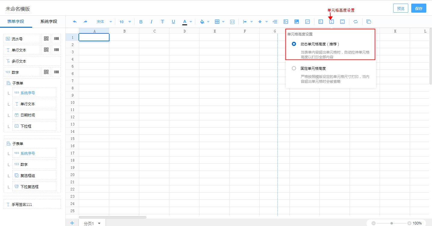 • 单元格高度推荐选择「动态高度」,打印时如果数据超出单元格高度,会自动拉伸以保证打印全部内容。如果是固定高度,则超出单元部分的内容,在打印时将被省略。