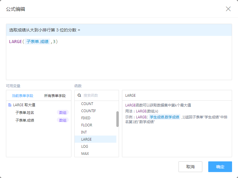| k | 数字字段、整型 | 返回数组中从大到小排行第 k 位的数值 |