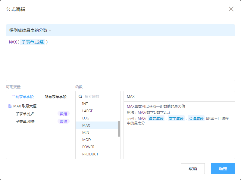 [number2], ... 数字字段、数值型 其他需要判断数组参数,非数字则按 0 处理