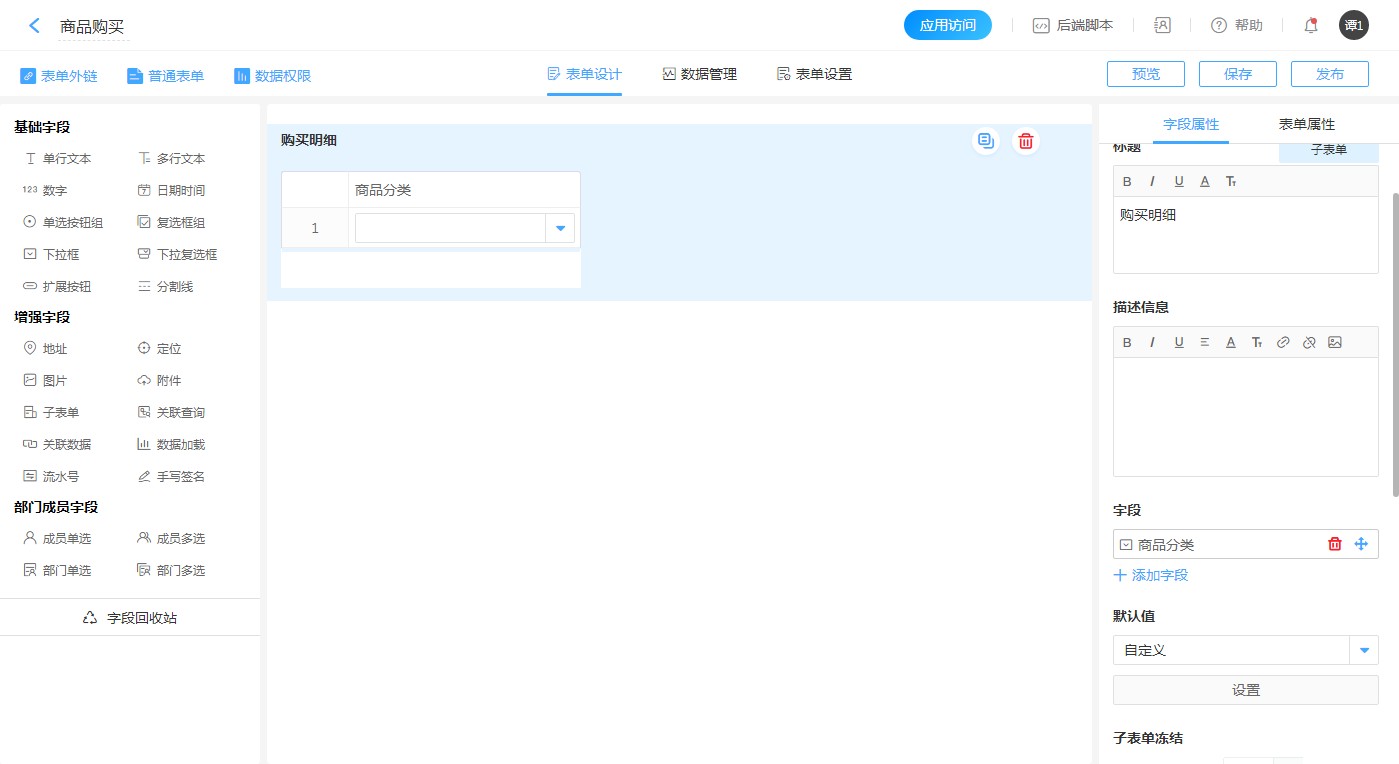 2、【子表单】控件属性“字段”添加1个【下拉框】字段,标题为:商品分类,数据关联到表单【商品信息】里的"商品分类"。