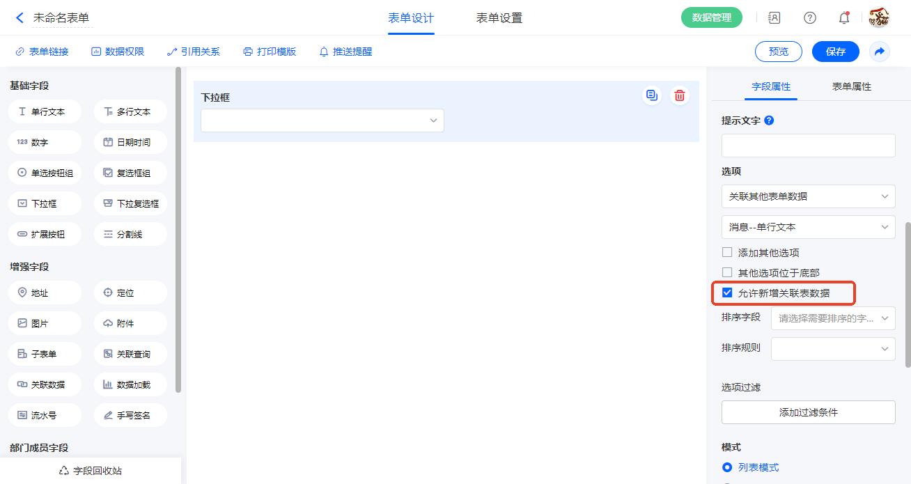 允许新增关联表数据:勾选后,支持新增关联表单的数据。