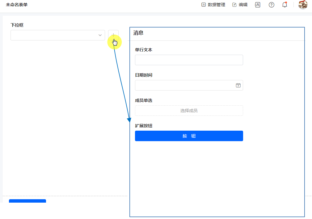 关联其他表单数据是指,调用其他表单中某个字段录入的所有数据作为下拉框的选项。