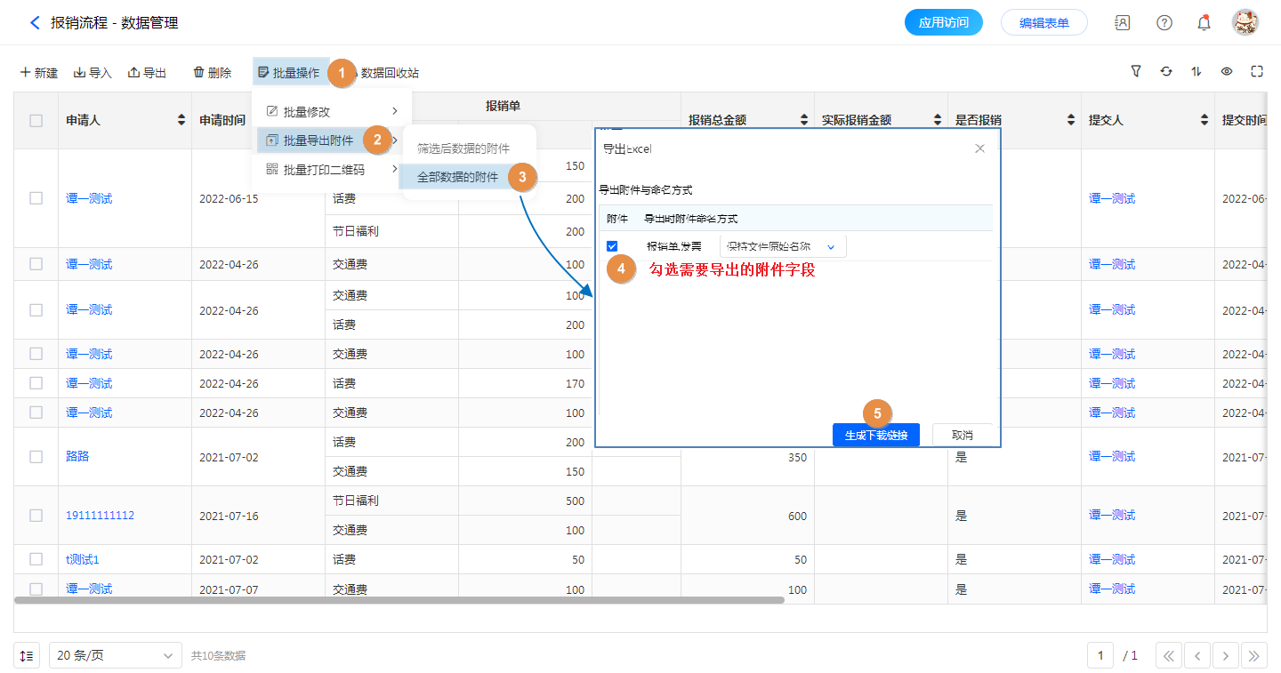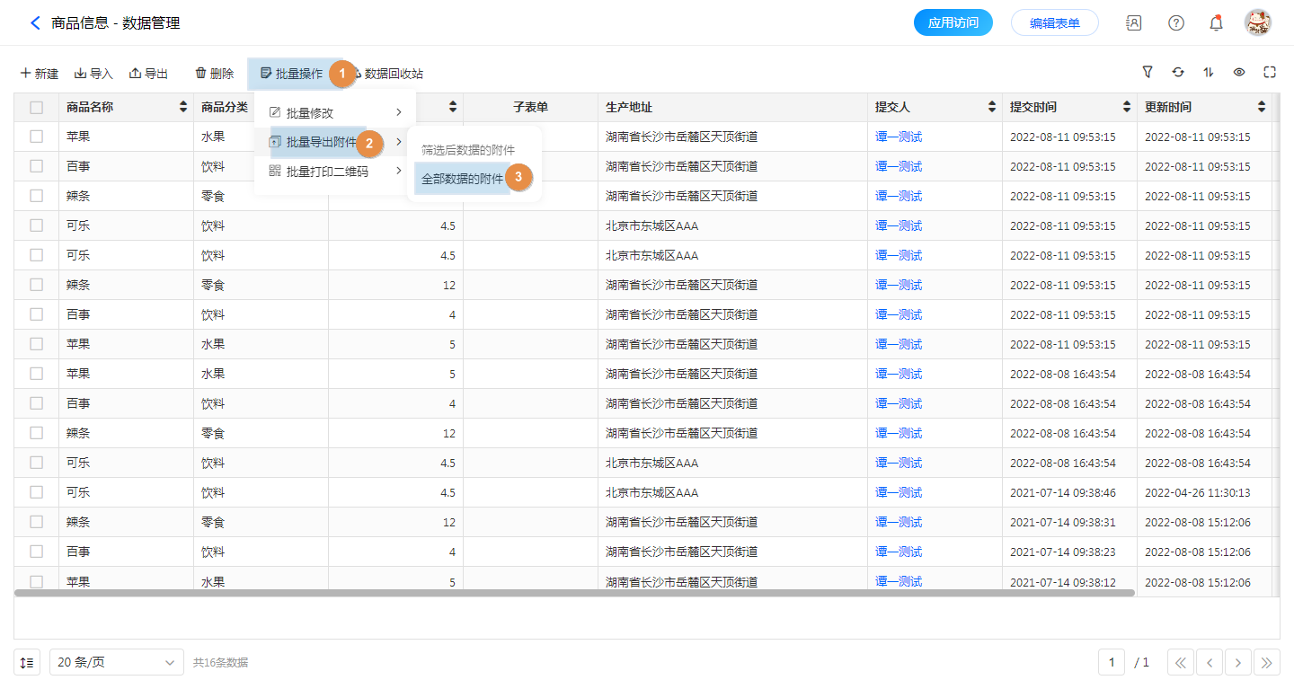 包含「附件字段」「图片字段」的表单,可以通过批量导出附件功能一次性下载数据中包含的附件。