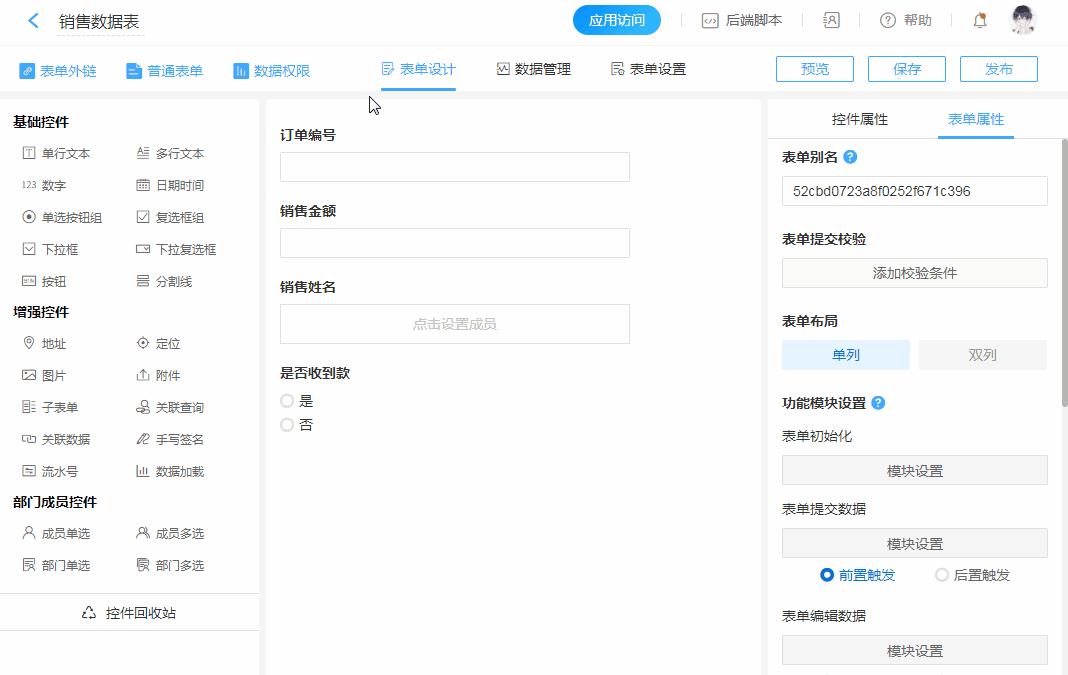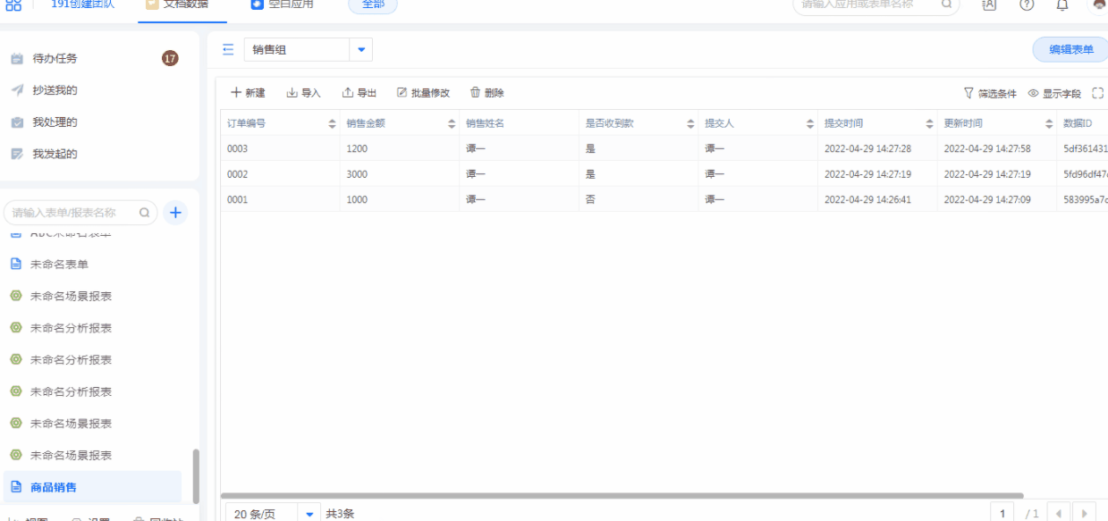 在【销售组】的数据列表里,可以查看数据、显示所需字段、新建数据。
