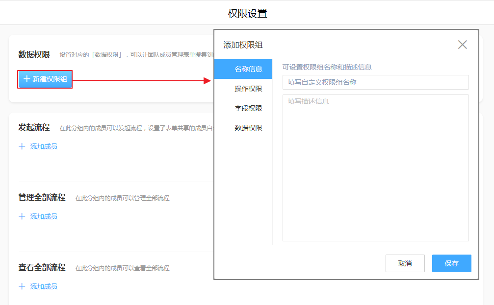 | 发起流程 | 提交数据、发起流程 | 流程发起节点的控件可见可编辑 | 提交数据、发起流程 | 设置了页面共享的成员自动加入此分组 |