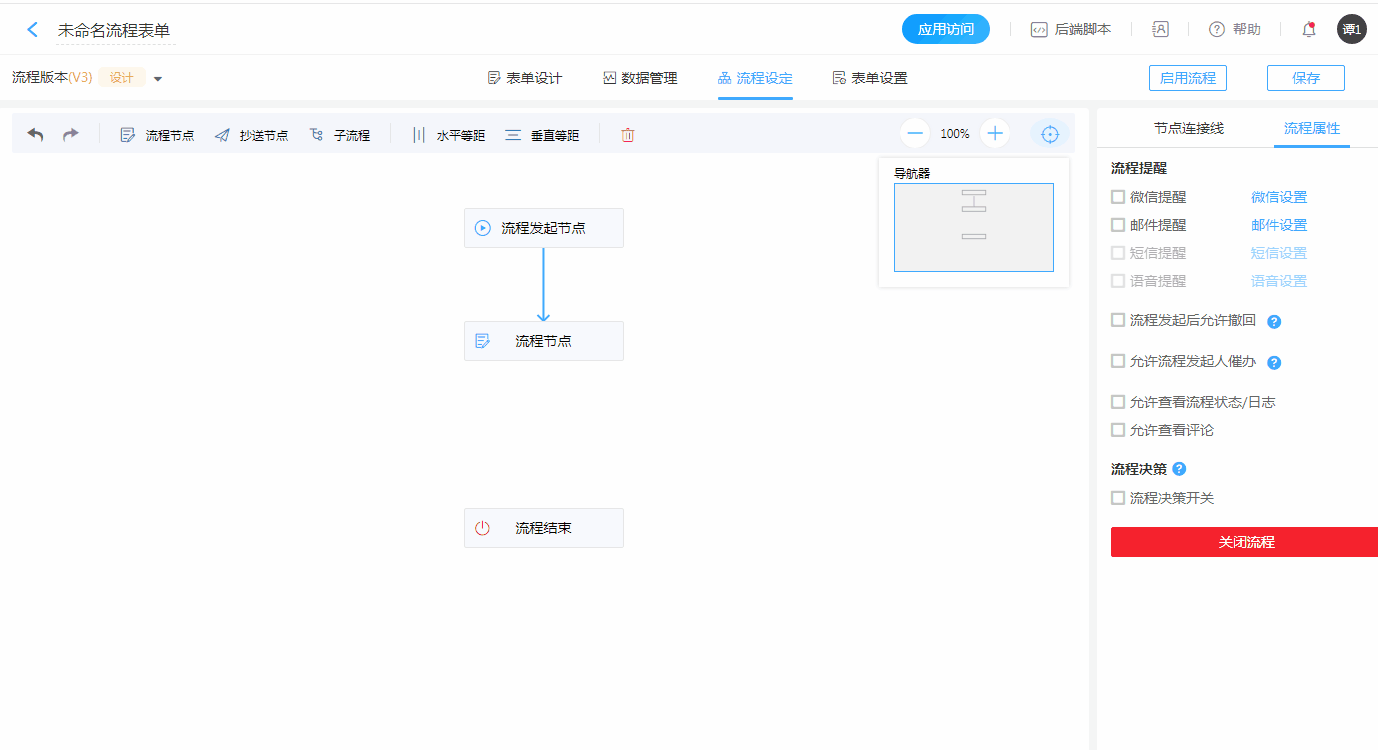 所有分支中的最后节点都必须要连接到「流程结束节点」,以「流程结束节点」为作为流程分支的终点。流程设计时不强制要求连接,按自己需求设计流程即可,在「启用流程」流程时系统会自动处理,与流程结束节点相连。