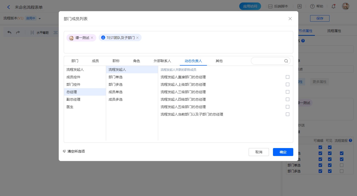 动态负责人可以选择流程发起人、职称,以及成员控件部门控件。