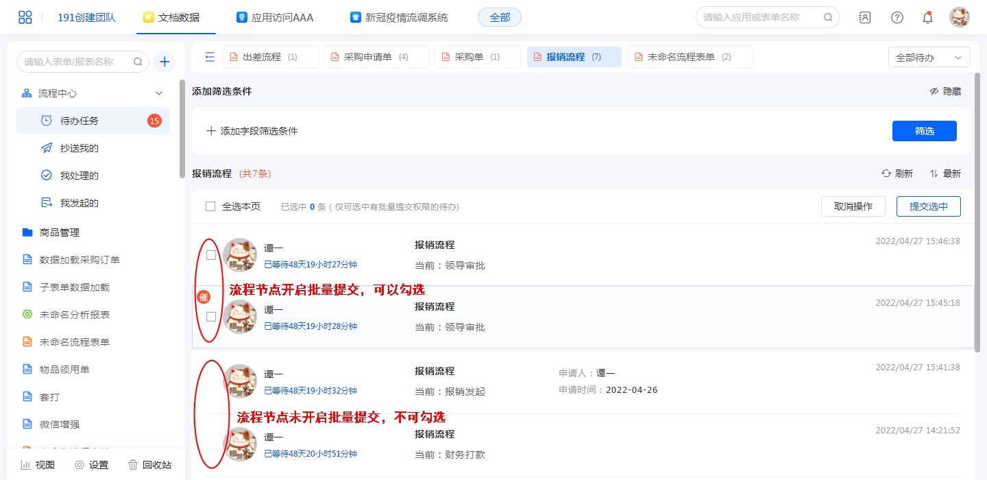 仅可在应用访问的「我的待办」处对流程进行批量提交,不可在工作台处的「待办任务」进行批量提交。
