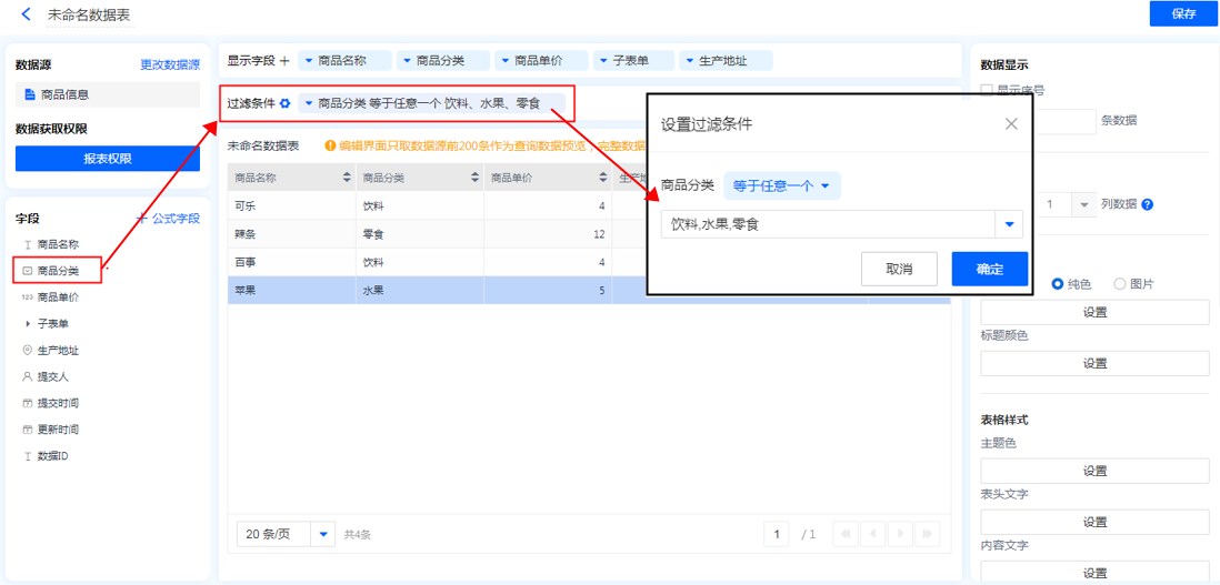 数据表中显示的数据,可以通过对过滤条件进行设置,只显示符合条件的数据。