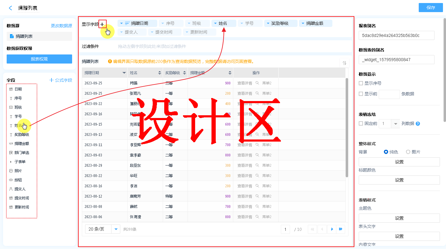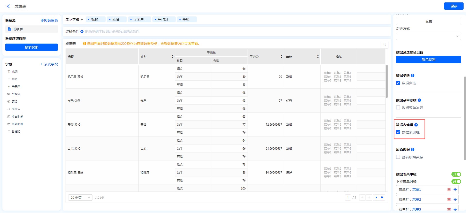 注意:需要数据源表单开启表格快捷编辑(在表单设置-更多设置中开启),数据表才会显示此属性。
