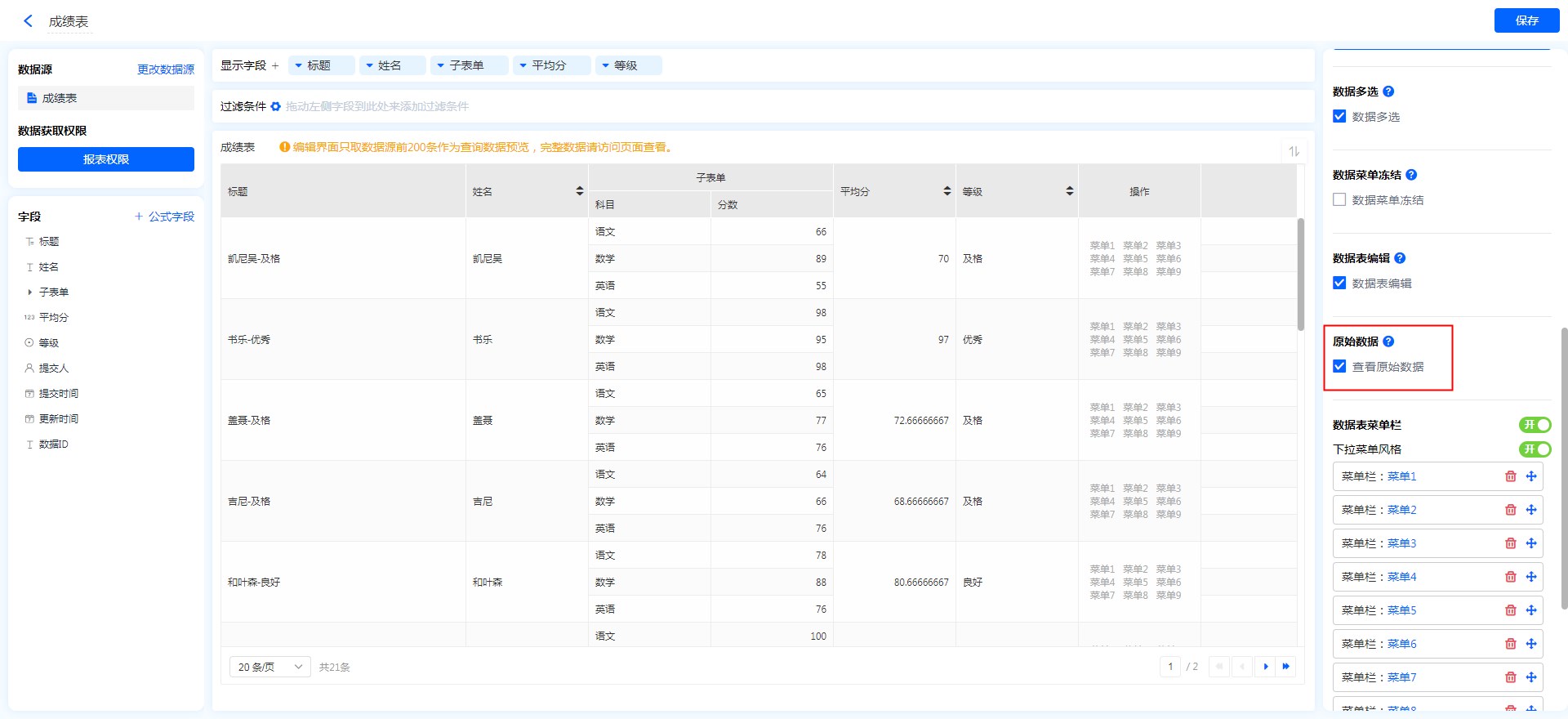数据表只展示了数据源表单的部分字段,查看原始数据则可查看数据源表单的所有字段,详情见查看原始数据。