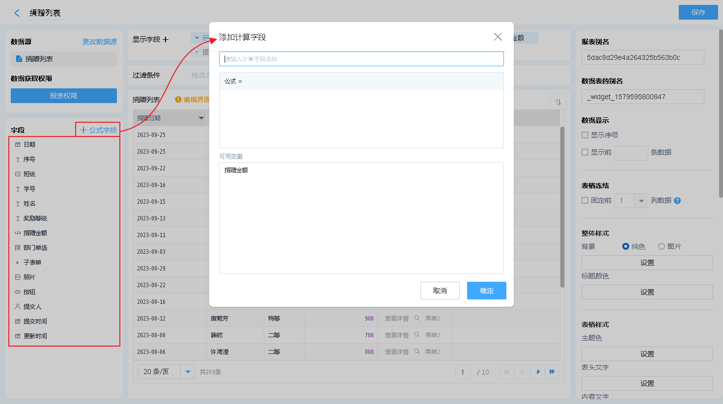 也可以通过增加公式字段,对报表中显示的内容进行简单的计算处理【仅支持四则运算(+-*/)】。