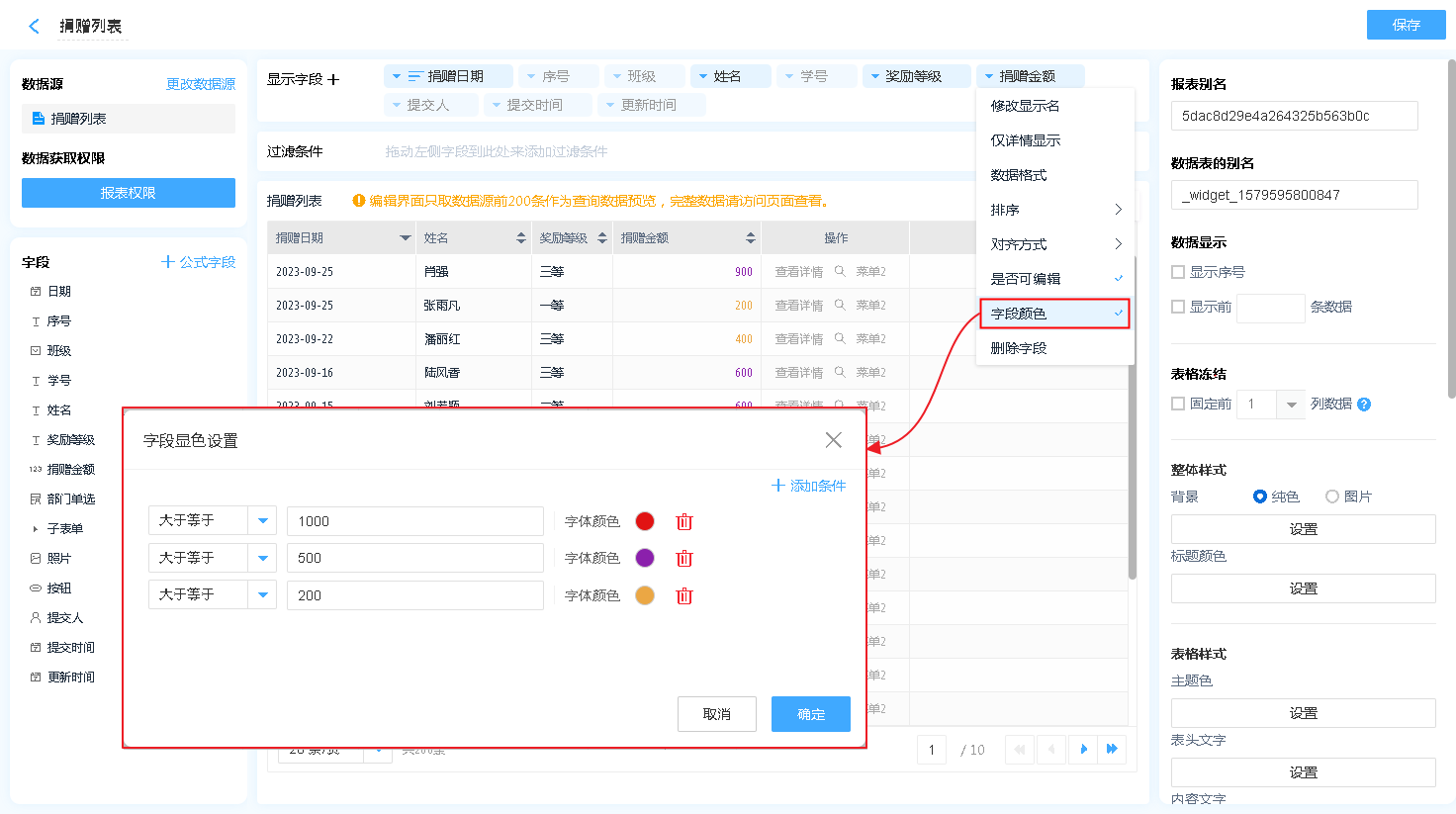 字段颜色:字段支持更改颜色,可设置条件对字段进行