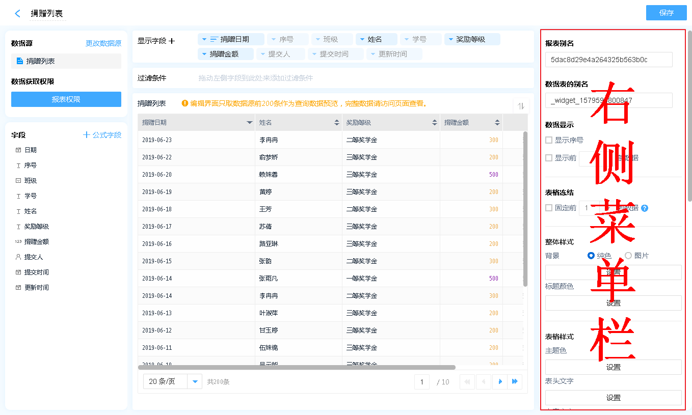 数据表的右侧菜单主要用来对数据表进行各种设置。
