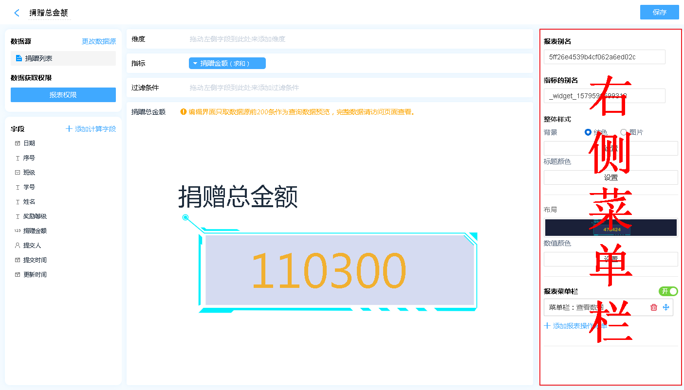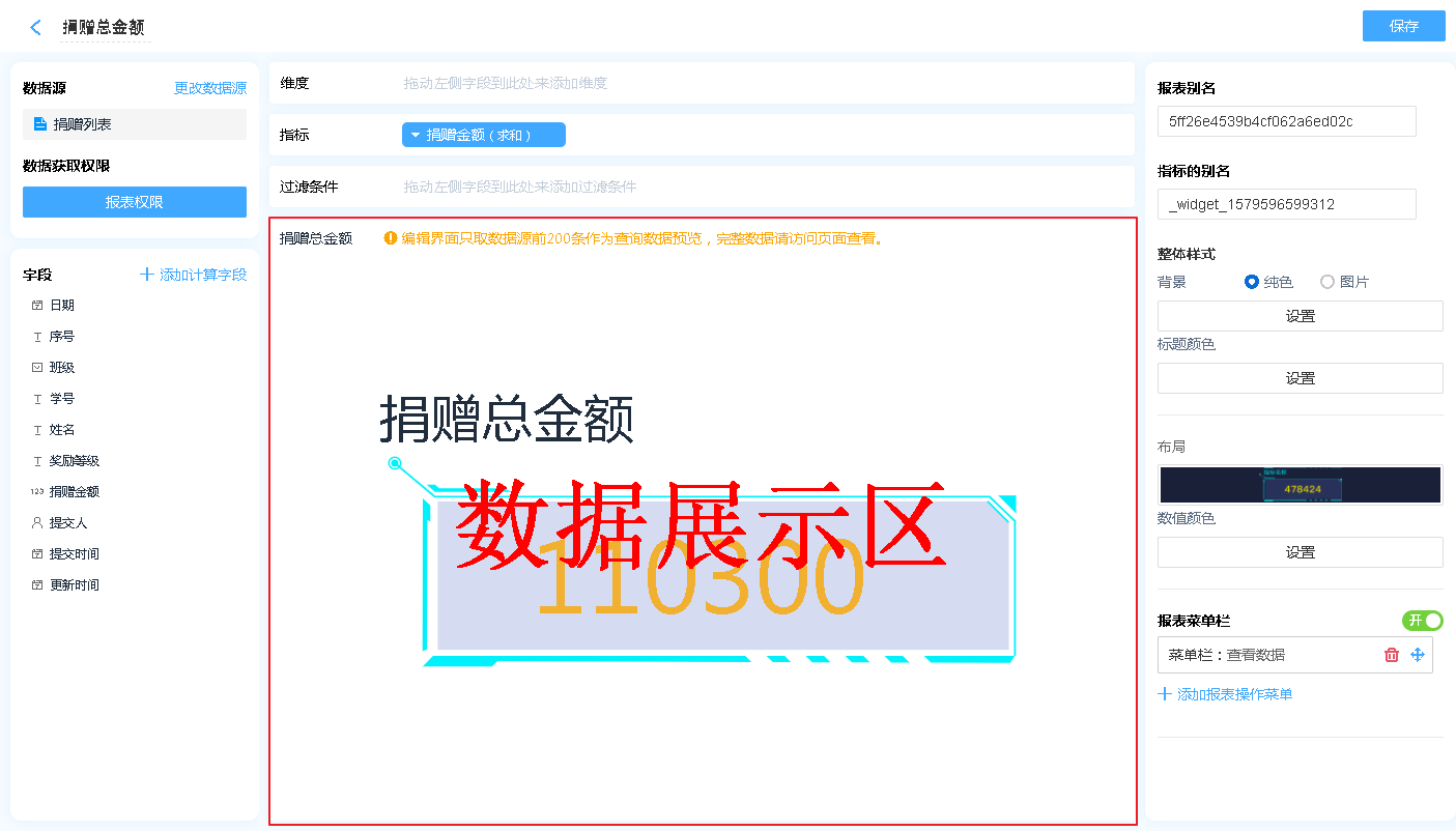 显示名称: 字段添加进入显示字段区域后,可自行修改其在指标中的表头文字汇总方式: 仅日期时间字段可设置,可以设置按照何种日期格式对数据进行汇总(如:按年、按季度、按月汇总)排序:支持按照指定的格式对指标内的数据进行排序[默认为数据创建时间]对齐方式:支持报表的排列方式删除字段:此处的删除字段,是指从显示字段中删除,删除后仍可重新添加,不会对原表造成任何影响。