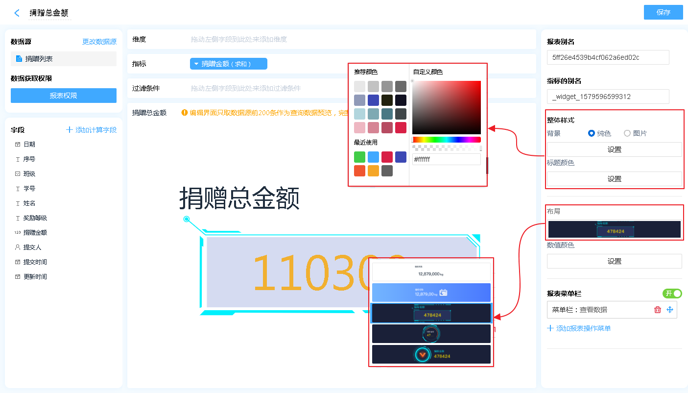 显示名称: 字段添加进入显示字段区域后,可自行修改其在指标图中的表头文字汇总方式: 指标的汇总方式仅支持数字字段,非数字字段在拖入指标中,汇总方式只有计数一项。字段颜色: 设置当指标的数值按照指定颜色进行显示。高级计算:高级计算可进行同环比、占比的计算,详见同环比和占比。数据格式:可通过数据格式的设计,在报表中显示自己想要的格式,详见数据格式详解。排序:支持按照指定的格式对指标图内的数据进行排序[默认为数据创建时间]对齐方式:支持报表单元格文字的排列方式删除字段:此处的删除字段,是指从指标中删除,删除后仍可重新添加,不会对原表造成任何影响。