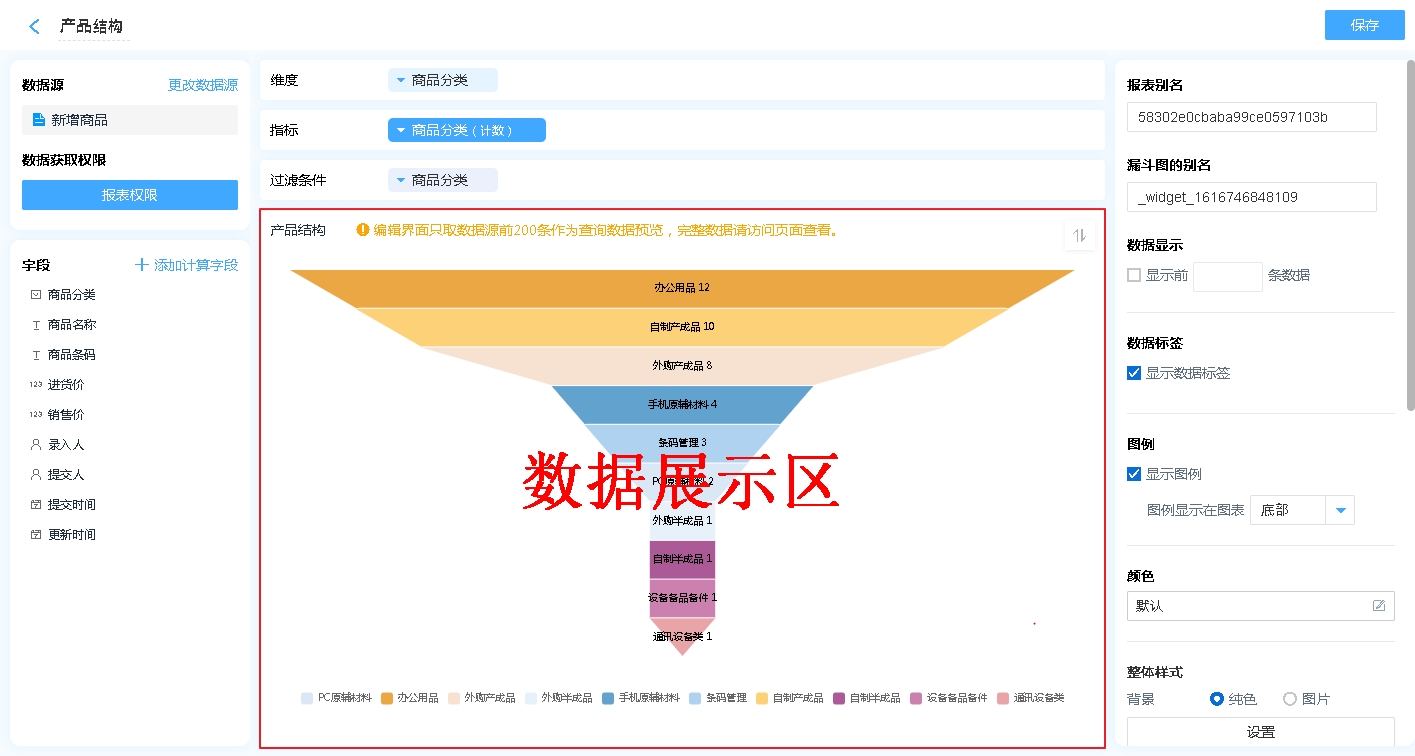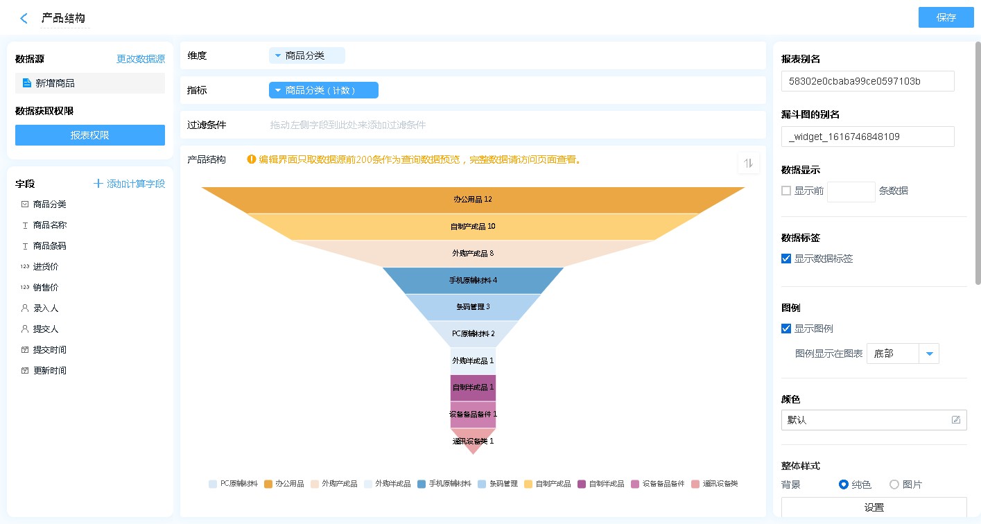 漏斗图适合有先后顺序的数据,由大到小,逐级减少的场景,如:客户转化率、产品结构等,如:进销存系统中,商品分析报表中就利用漏斗图实现的产品结构图,方便管理者了解当前产品结构。
