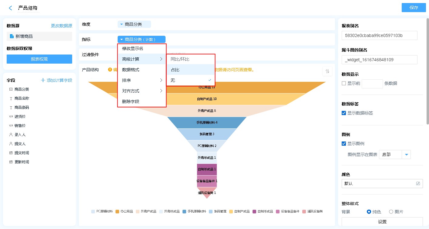 显示名称: 字段添加进入显示字段区域后,可自行修改其在漏斗图中的表头文字高级计算:高级计算可进行同环比、占比的计算,详见同环比和占比。数据格式:可通过数据格式的设计,在报表中显示自己想要的格式,详见数据格式详解。排序:支持按照指定的格式对漏斗图内的数据进行排序[默认为数据创建时间]对齐方式:支持报表单元格文字的排列方式删除字段:此处的删除字段,是指从指标中删除,删除后仍可重新添加,不会对原表造成任何影响。