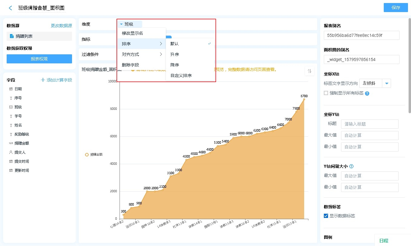 显示名称: 字段添加进入显示字段区域后,可自行修改其在面积图中的表头文字汇总方式: 仅日期时间字段可设置,可以设置按照何种日期格式对数据进行汇总(如:按年、按季度、按月汇总)排序:支持按照指定的格式对面积图内的数据进行排序[默认为数据创建时间]对齐方式:支持报表的排列方式删除字段:此处的删除字段,是指从显示字段中删除,删除后仍可重新添加,不会对原表造成任何影响。