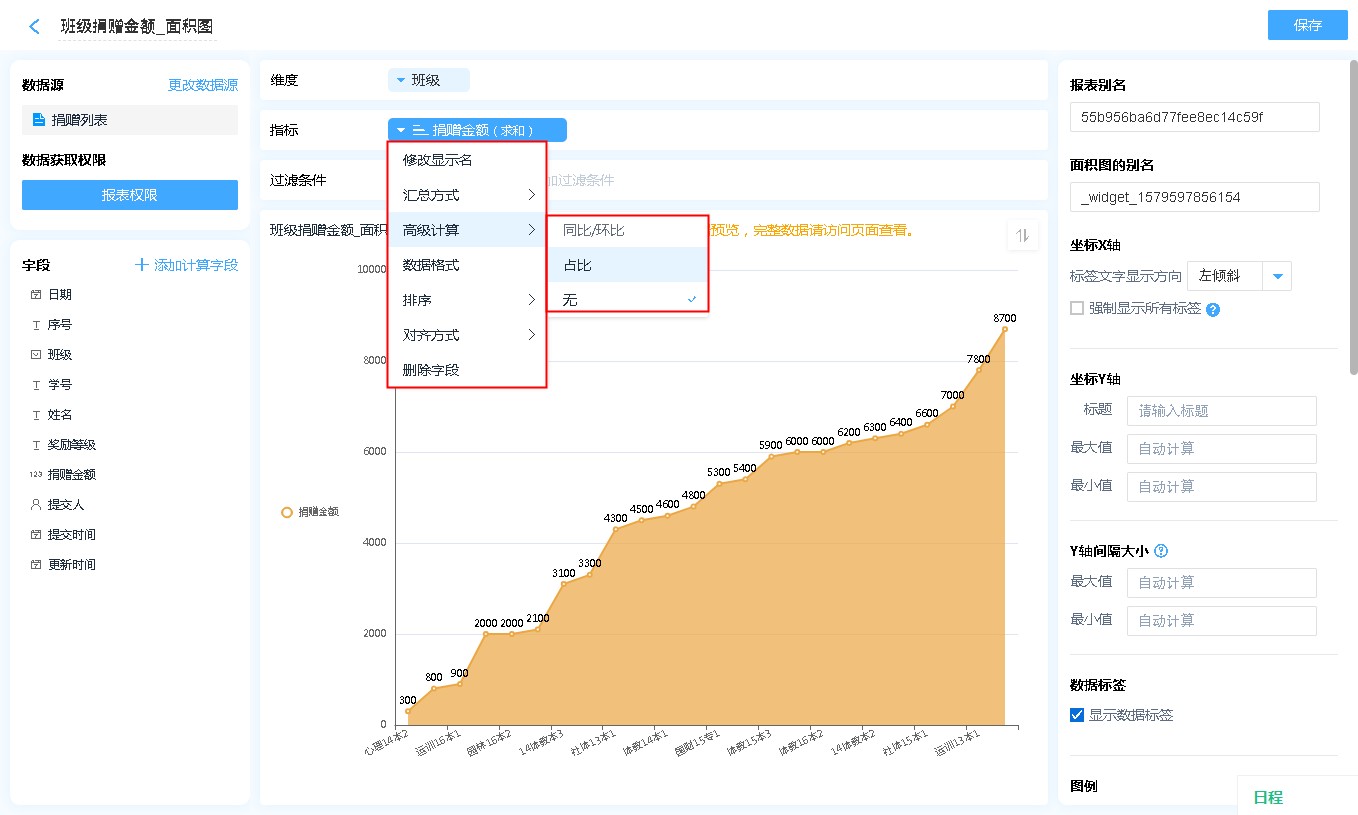 显示名称: 字段添加进入显示字段区域后,可自行修改其在面积图中的表头文字汇总方式: 指标的汇总方式仅支持数字字段,非数字字段在拖入指标中,汇总方式只有计数一项。高级计算:高级计算可进行同环比、占比的计算,详见同环比和占比。数据格式:可通过数据格式的设计,在报表中显示自己想要的格式,详见数据格式详解。排序:支持按照指定的格式对面积图内的数据进行排序[默认为数据创建时间]对齐方式:支持报表单元格文字的排列方式删除字段:此处的删除字段,是指从指标中删除,删除后仍可重新添加,不会对原表造成任何影响。