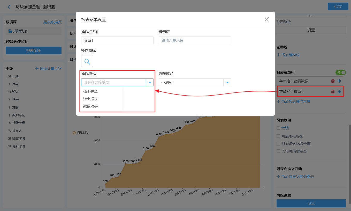 报表菜单 支持 弹出表单、弹出报表、数据助手