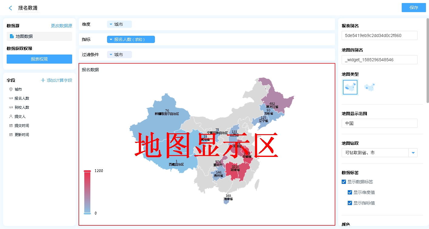 - 显示维度值:在地图上对应的区域显示维度的内容,一般情况下是省/市/县区信息。