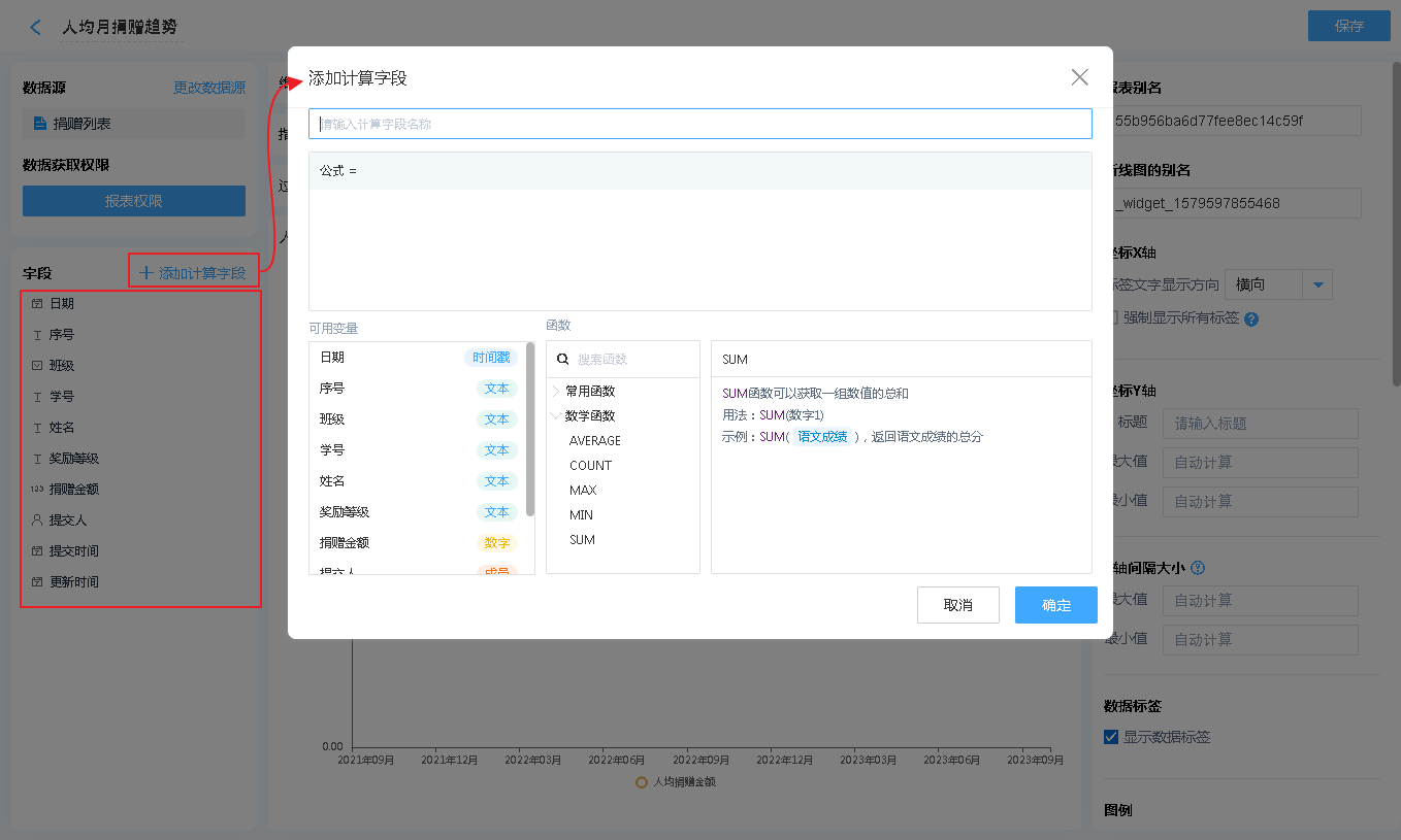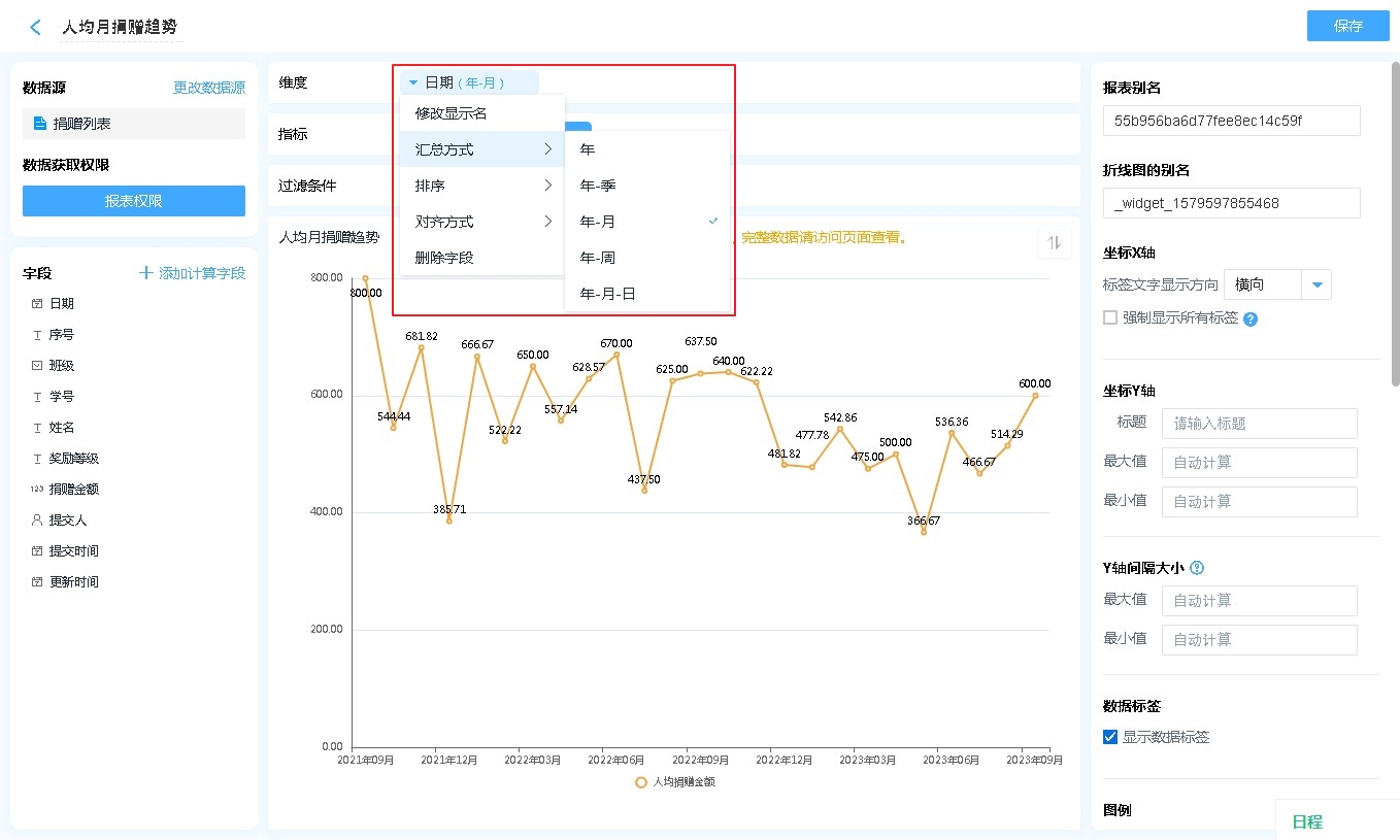 显示名称: 字段添加进入显示字段区域后,可自行修改其在折线图中的表头文字汇总方式: 仅日期时间字段可设置,可以设置按照何种日期格式对数据进行汇总(如:按年、按季度、按月汇总)排序:支持按照指定的格式对折线图内的数据进行排序[默认为数据创建时间]对齐方式:支持报表的排列方式删除字段:此处的删除字段,是指从显示字段中删除,删除后仍可重新添加,不会对原表造成任何影响。