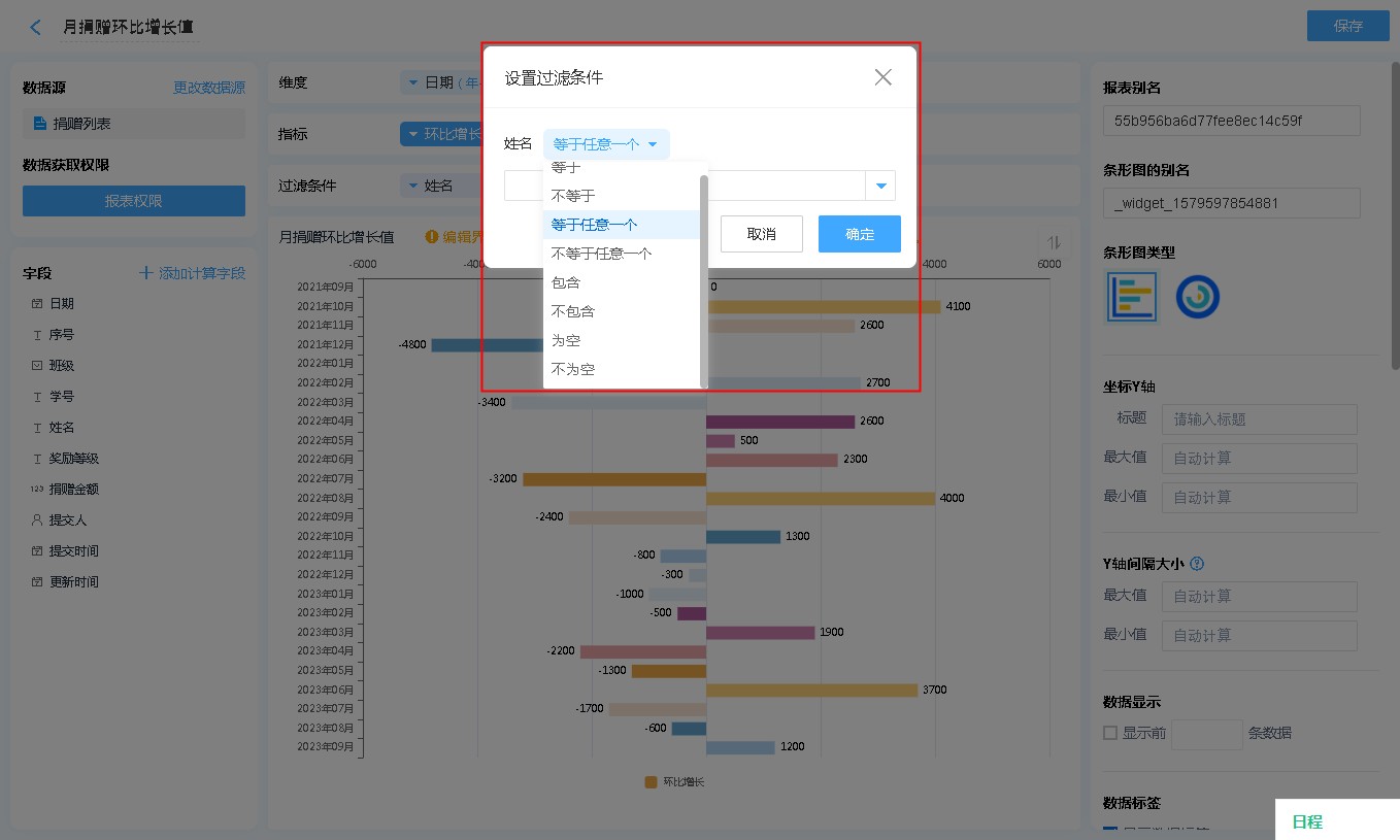 • 显示名称: 字段添加进入显示字段区域后,可自行修改其在条形图中的表头文字