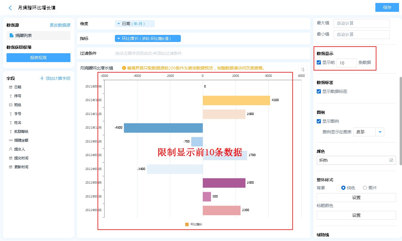 可以设置当前条形图显示数据条数,如:可以设置仅显示前10条数据等。