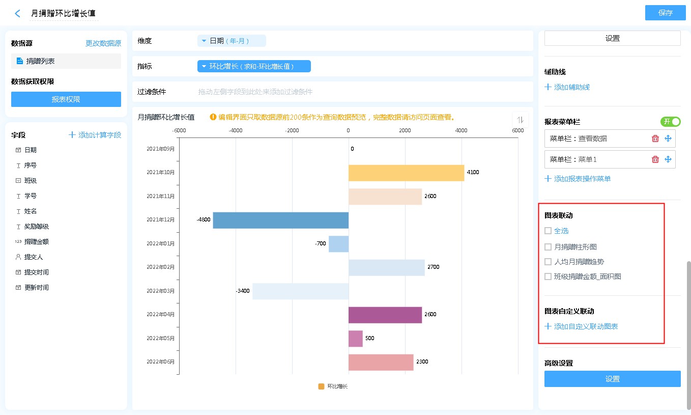在图表联动的基础上,图表还支持自定义联动,图表自定义联动即可设置不同数据源的图表进行联动。