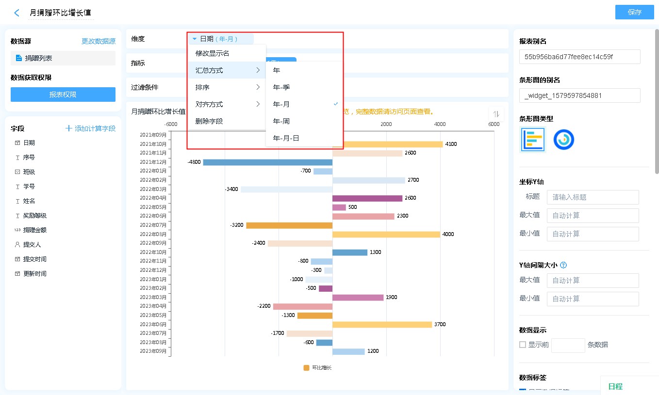 • 汇总方式: 仅日期时间字段可设置,可以设置按照何种日期格式对数据进行汇总(如:按年、按季度、按月汇总)