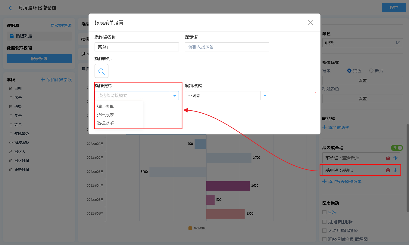 报表菜单 支持 弹出表单、弹出报表、数据助手