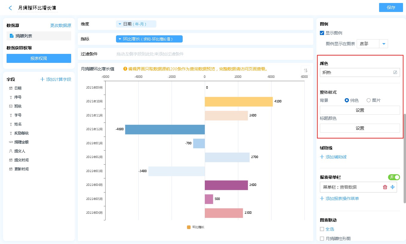 条形图支持样式自定义,可自定义的包括:样式、颜色