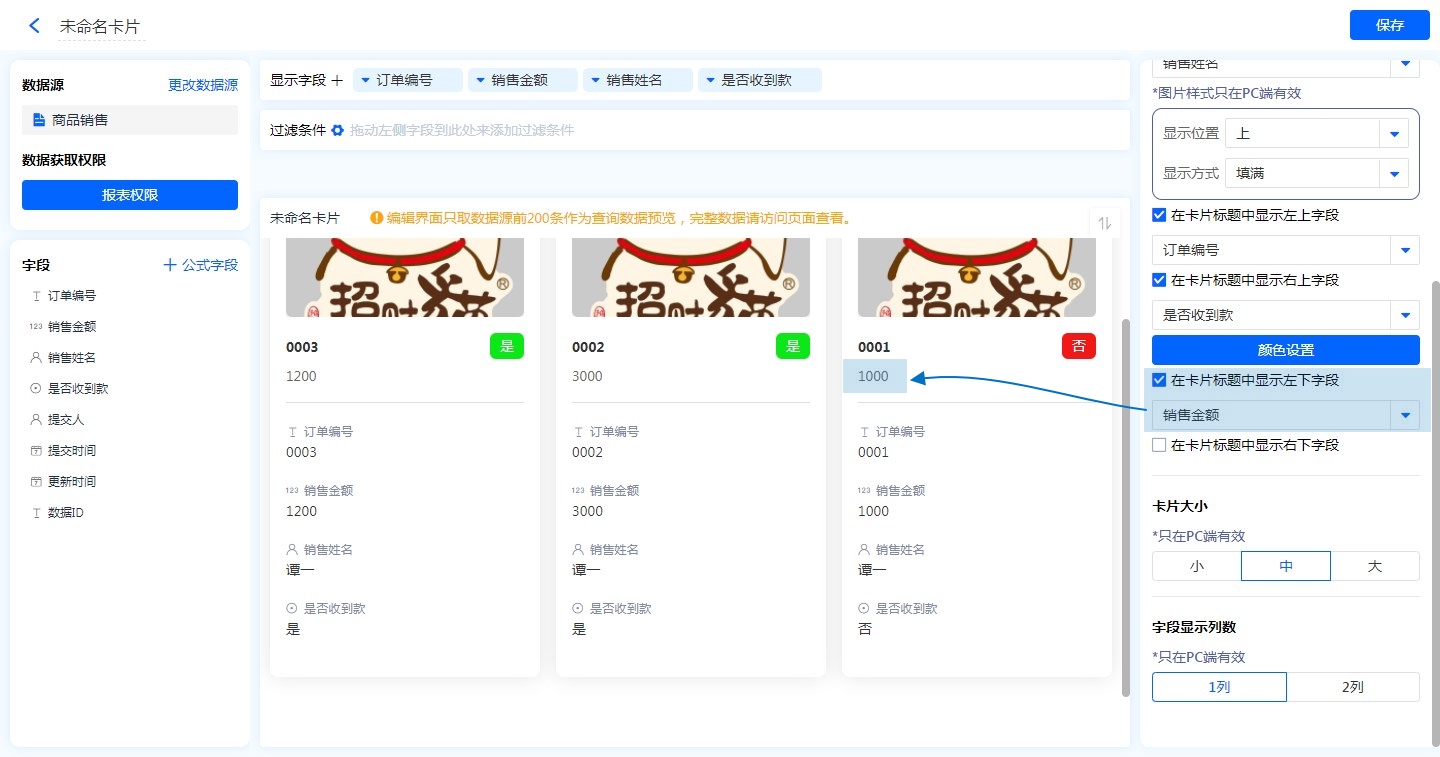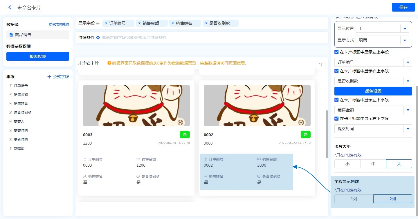 当卡片大小设置中/大时,可以设置字段显示列数。