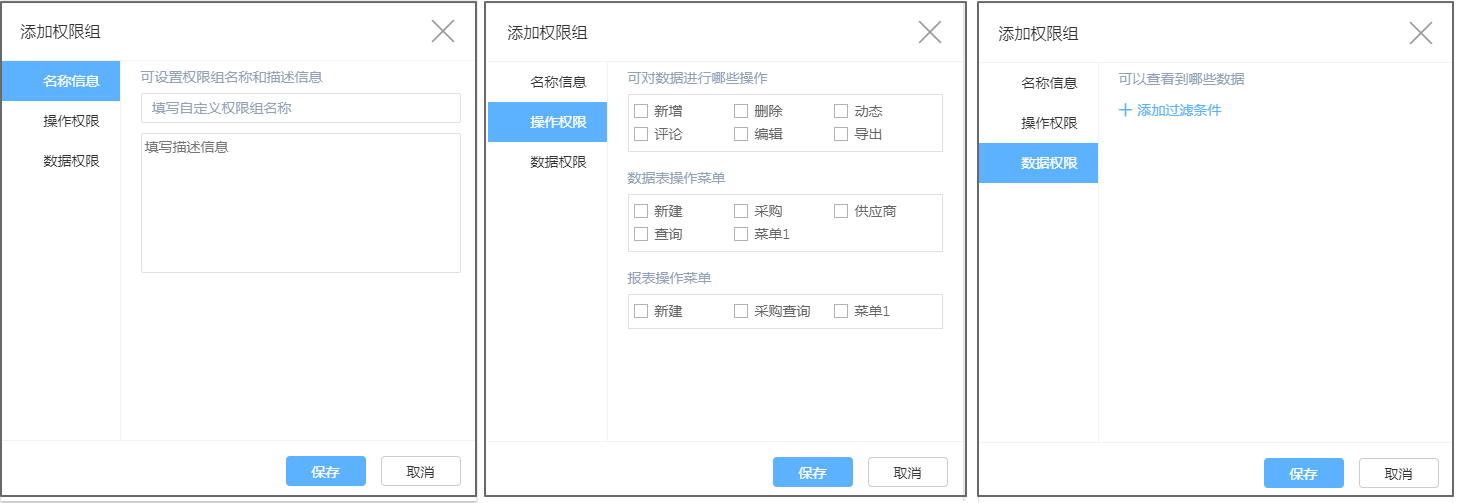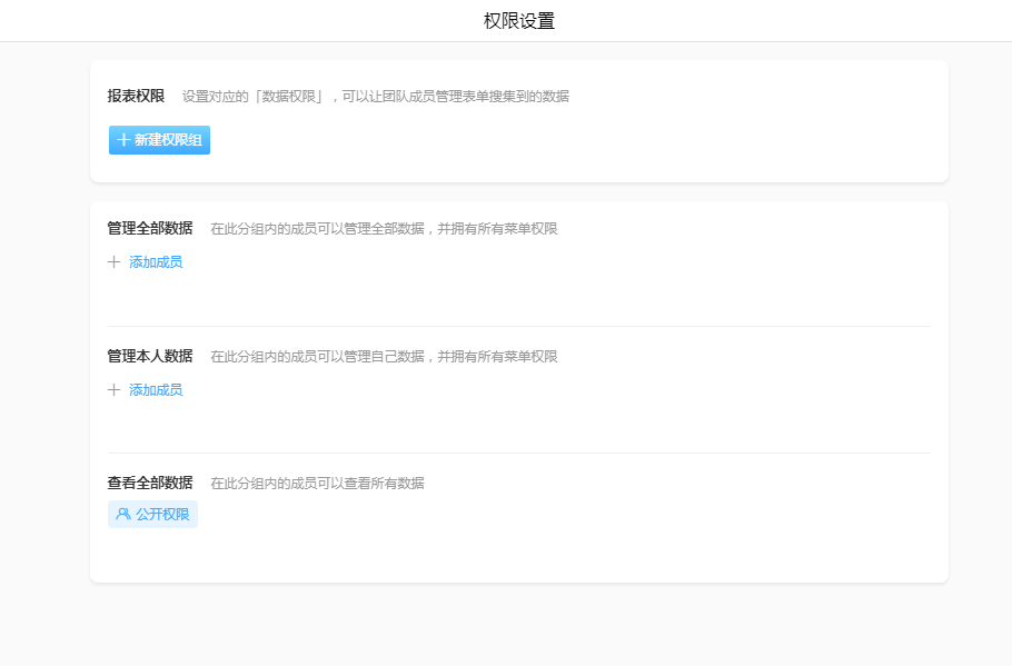 系统已经提供了一些常见的权限组设置:管理全部数据、管理本人数据、查看全部数据。