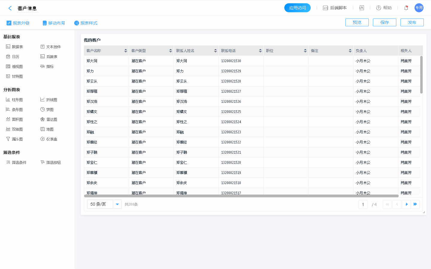 筛选条件是由管理员指定,使用者可以进行针对性的调整,常见使用场景如:学生信息表,由管理员指定条件,如:班级、姓名,使用者进行数据的选择或输入,对数据进行筛选。