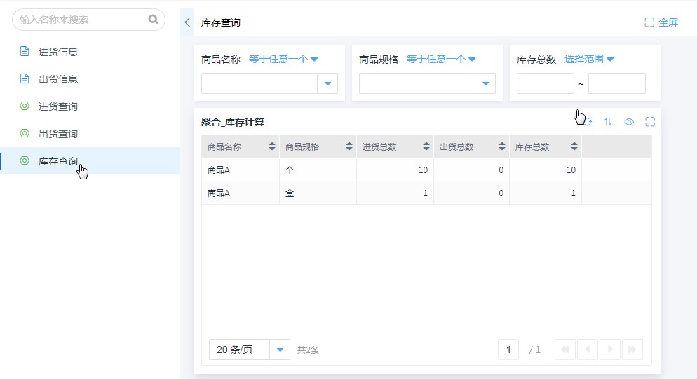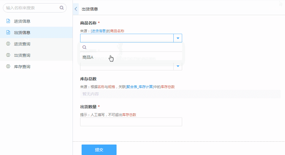 填写“出货数量”大于“库存总数”,触发聚合表“校验条件”,拦截本次操作。