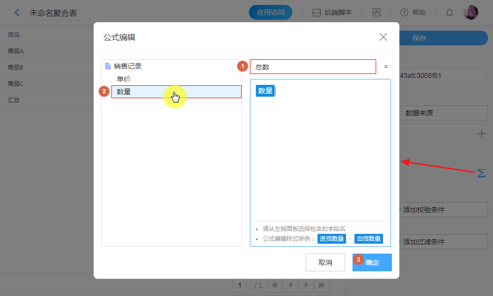 只配置一个字段,直接求和。(聚合公式支持 加减乘除( + - * / ))