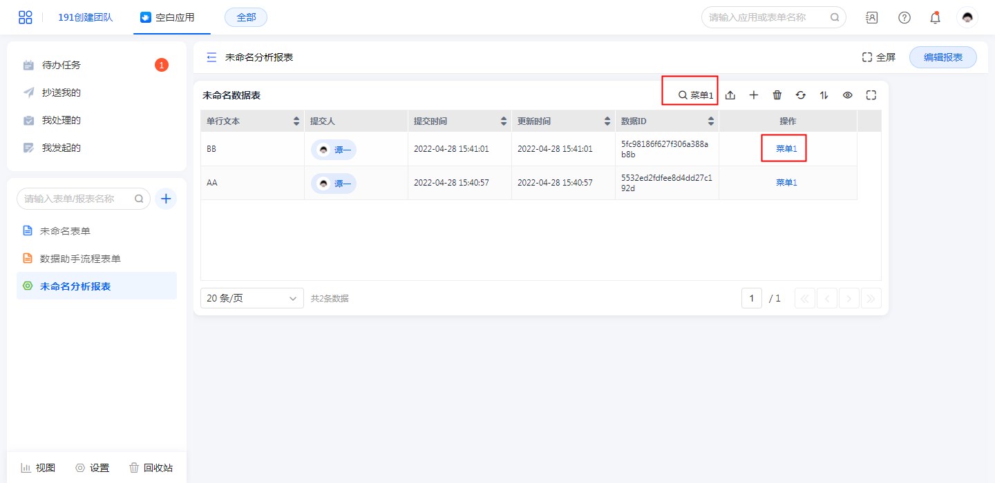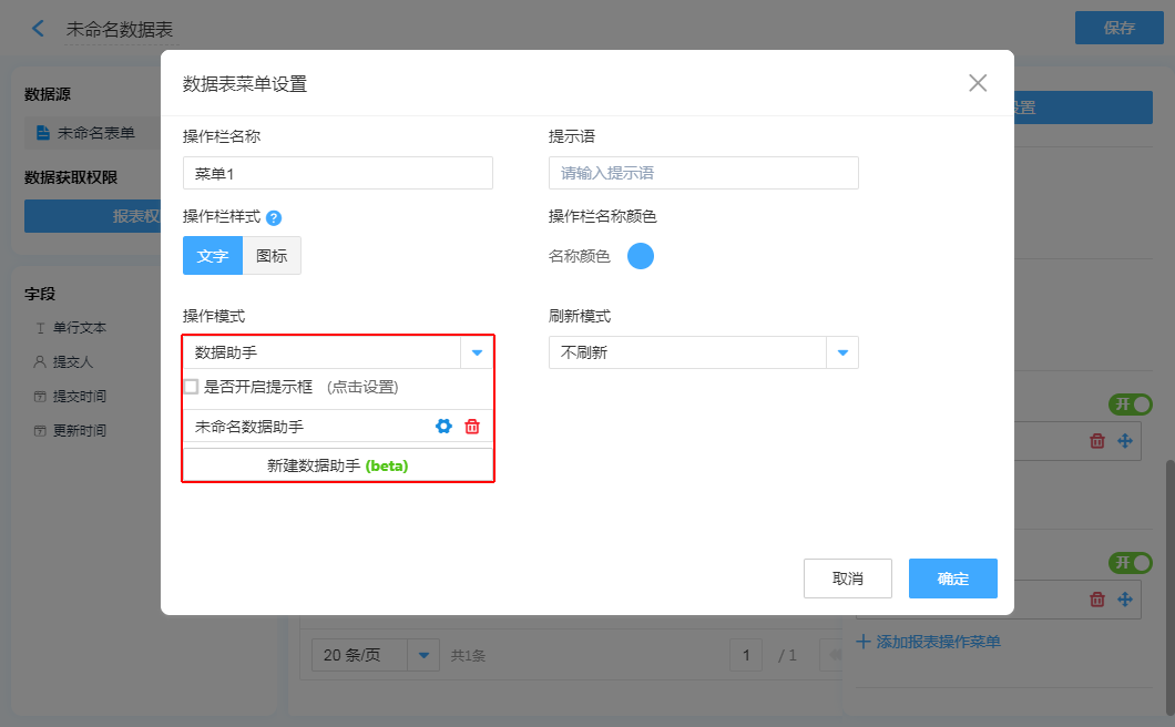 ①、数据表菜单:只在“数据表”中可配置,触发后会把当前这一行数据传入“数据助手”执行功能。